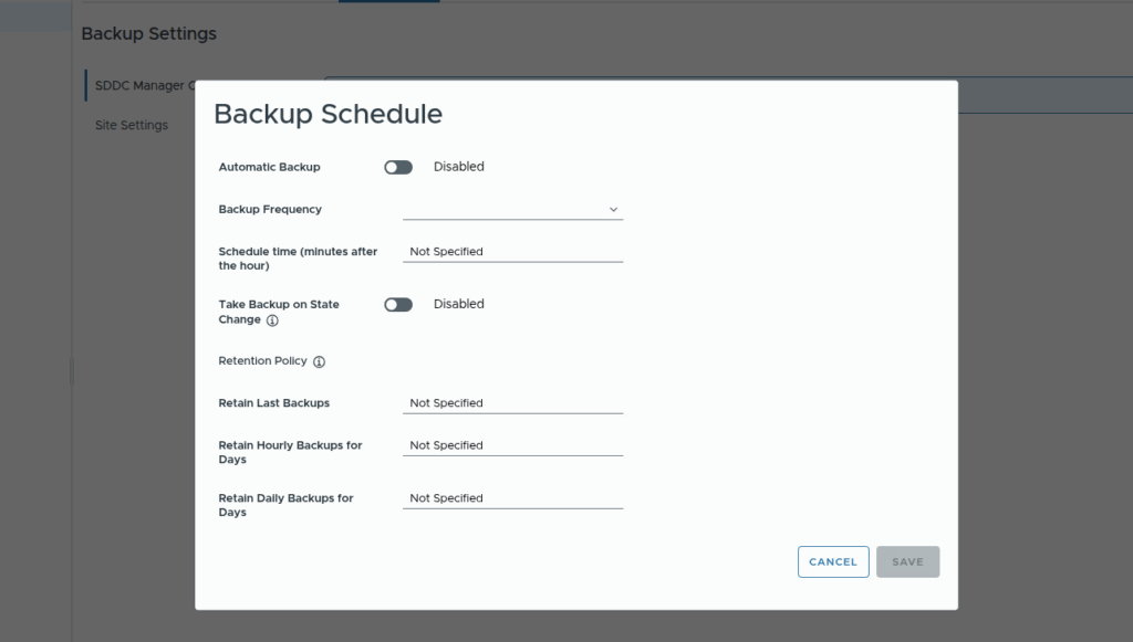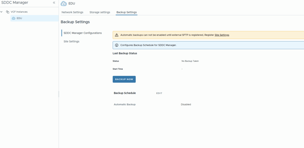 Backup implementation for VMware component is fairly easy. Just the requirements is to configure SFTP server in proper way and make it network available to the VMware components.