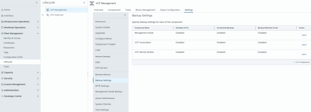 Backup for VCF Management Node, VCF Automation and VCF Identity Broker can be configured also in VCF Operations, in Fleet Management -> lifecycle -> settings -> backup settings