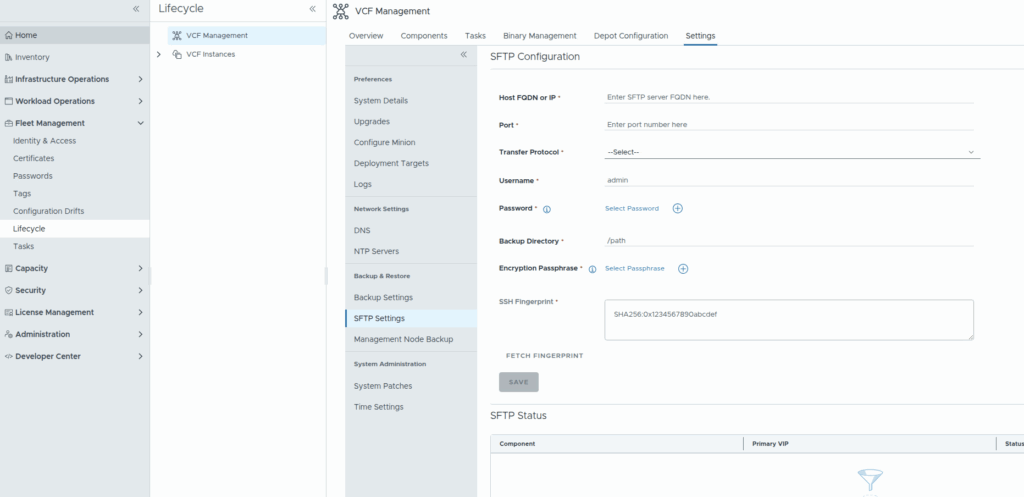 Firstly, configure SFTP Settings (VCF Operations, in Fleet Management -> lifecycle -> settings -> SFTP Settings) with the following parameters:
